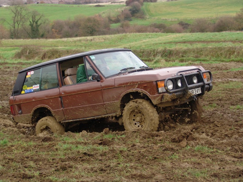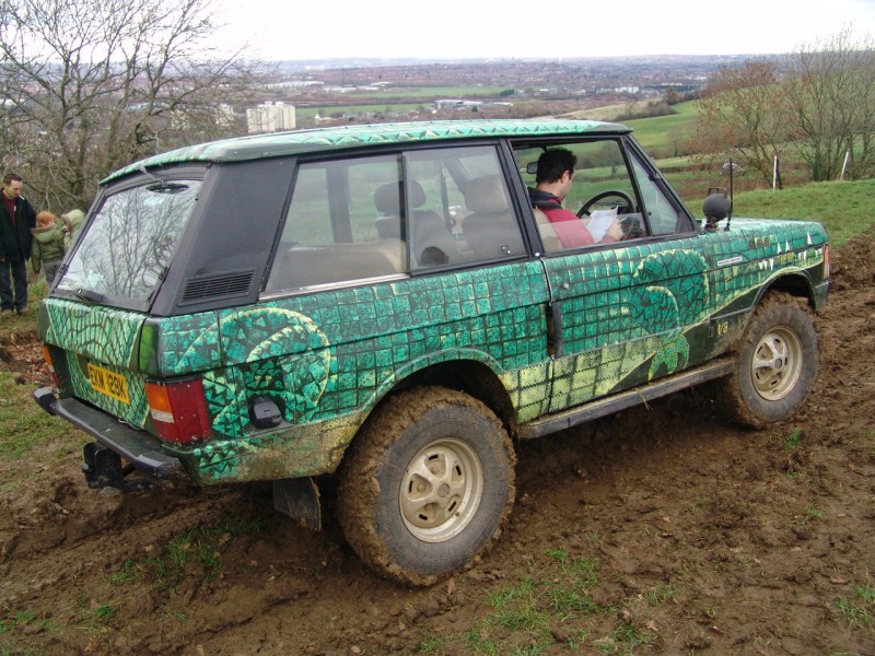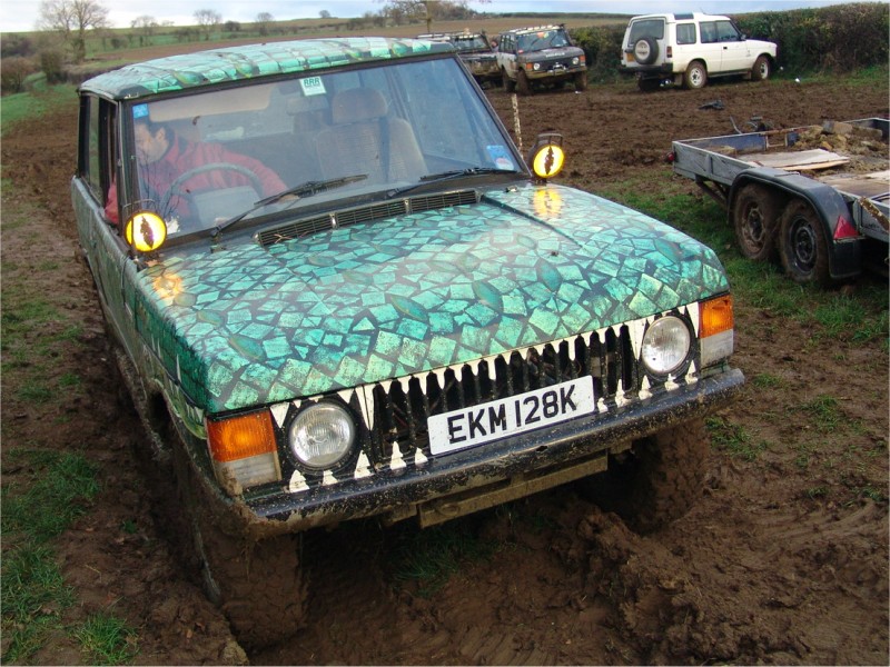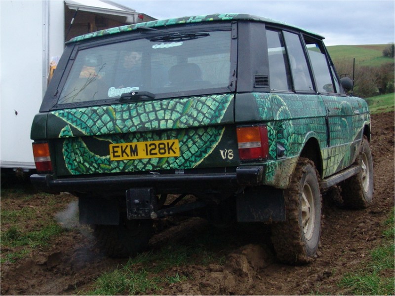... or rebuild it to concours condition (not cheap and would take a lot of time and effort). If I was to rebuild my Range Rover to as good as new (or better), I could get some ideas, tips and techniques from the team restoring the first Range Rover off the production line. I could custom paint my two door Range Rover as a reptile such as a crocodile. The paint scheme below was inspired by a book owned by the driver's daughter and was applied by the driver. Very impressive including the spot lights as eyes. I would however have to ensure I didn't damage any body panels requiring them to be replaced. A 'standard', unmodified two door Range Rover can perform well off road. Home Tomcats Other Options Off Road Racers |