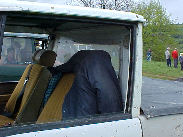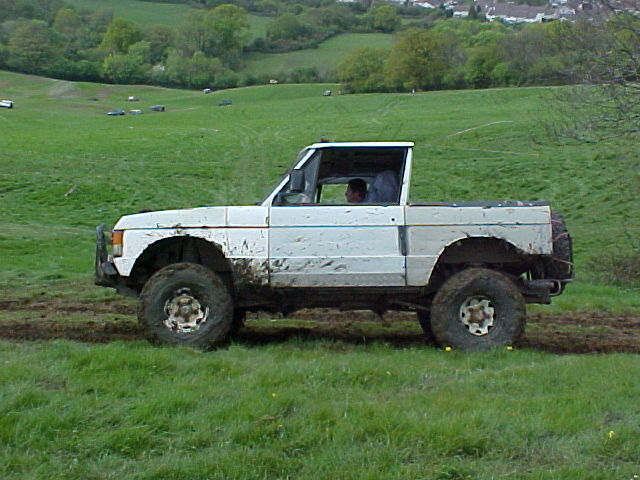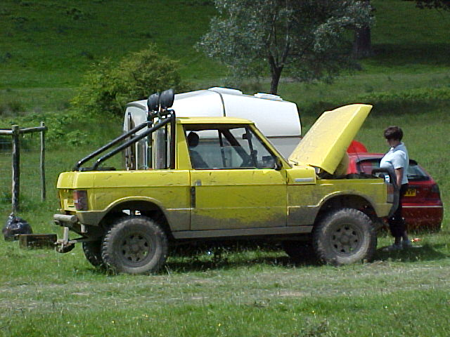 The first bobtail Range Rover pick up below had only been bought by its new owner a few days before he took it out for the first time. It arrived (and left) on a trailer, which was a good thing as it had some reliability problems. Look at the photograph to the right (click on it for a bigger picture) and see if you can see why the Rover V8 engine was not performing very well. This was fixed so the owner could have fun in the mud. |