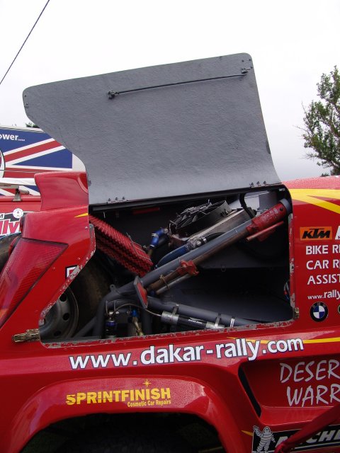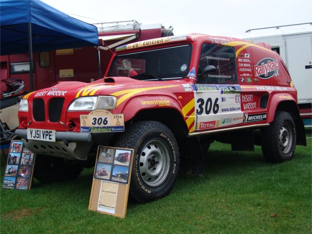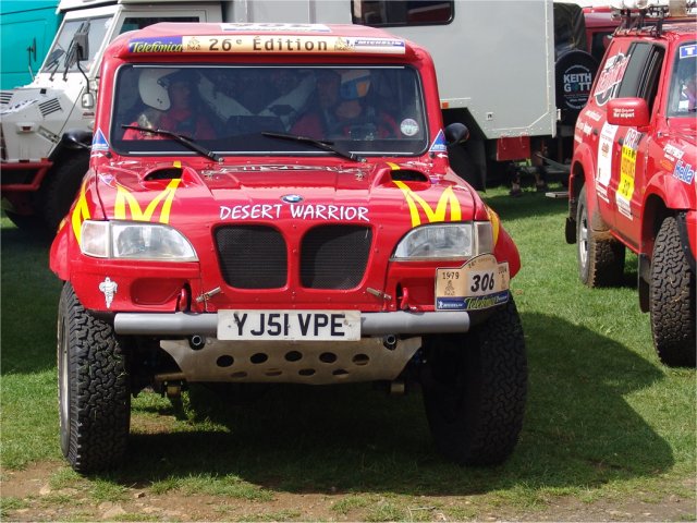 The Desert Warrior is constructed on a purpose built chassis made from 3" tubing, not a donor chassis like the Tomcat. The design of the chassis means that things like the fuel tank can be mounted lower down than in a Bowler Wildcat and the centre of gravity is lower. This makes the Desert Warrior more stable than a Bowler Wildcat. The Desert Warrior also has a longer wheelbase at 106 inches than the Bowler Wildcat or Range Rover/Tomcat at 100 inches. This makes it more stable at speed when racing in the desert, in a straight line, but harder to turn. This makes it less suitable for me as I intend to use my off-roader around a busy city. Desert Warrior WallpaperChoose the most appropriate size of Desert Warrior wallpaper for your screen. Paul is now arranging for all the parts to be made by experts in their fields eg. the body by a GRP expert. He will then be putting together a kit of parts so that other people can build their own Desert Warrior. For more details and photos of Rally Raid UK’s rally raid and Dakar successes, try (http://gallery.rallyraid.co.uk/gallery/index.asp). Home Tomcats Other Options Off Road Racers |