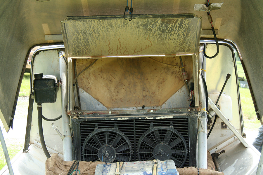 However it does have a 5.7 litre V8 Chevy engine with a Weber carburettor on an Edelbrock manifold, a set of air horns in the scoop for the rear mounted radiator and a nice, cut down Tomcat front bumper.