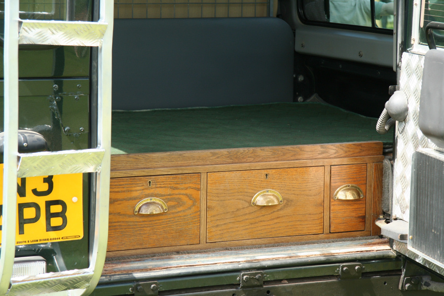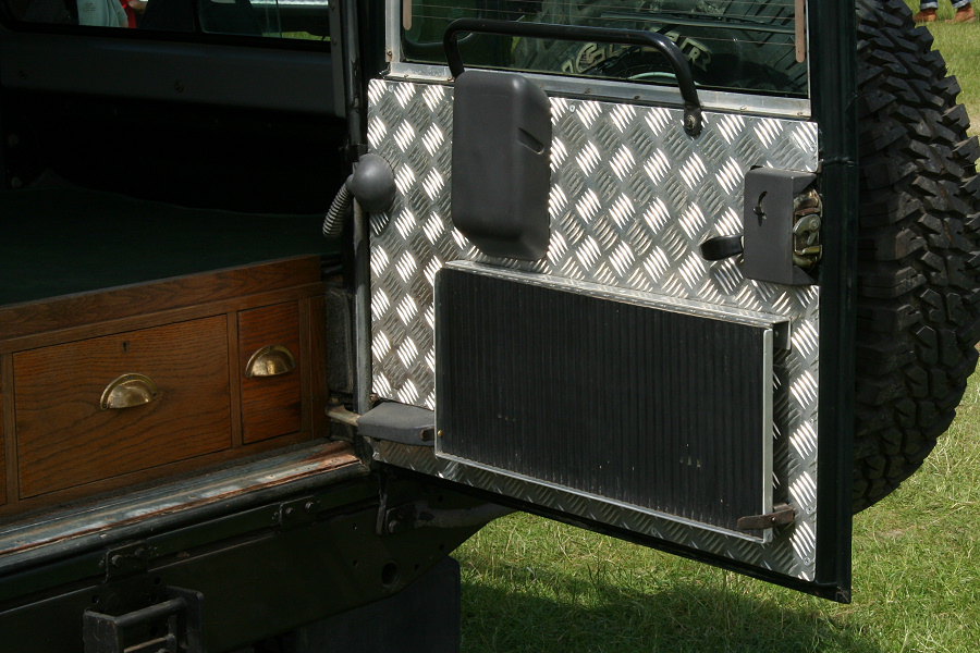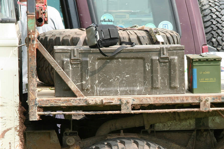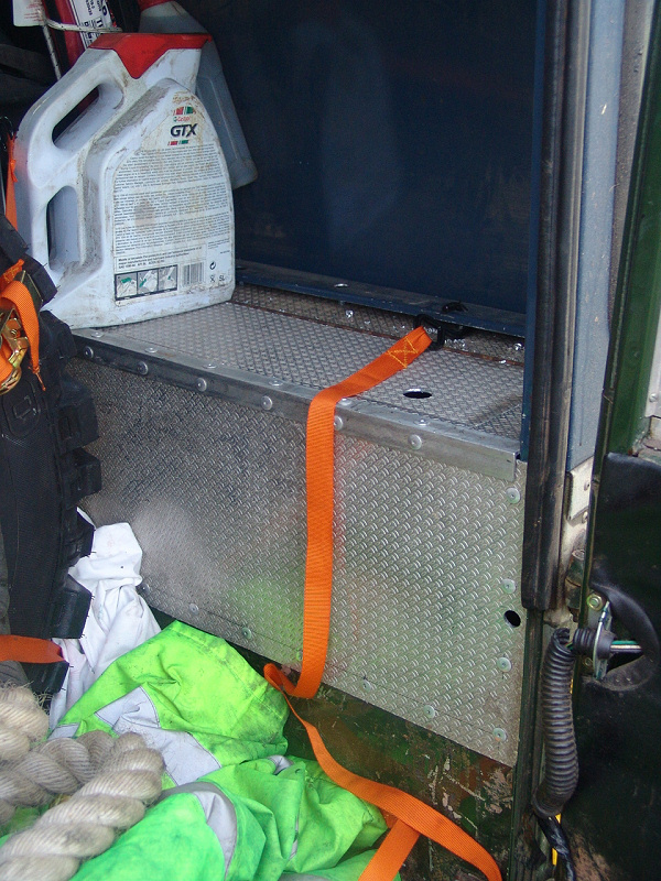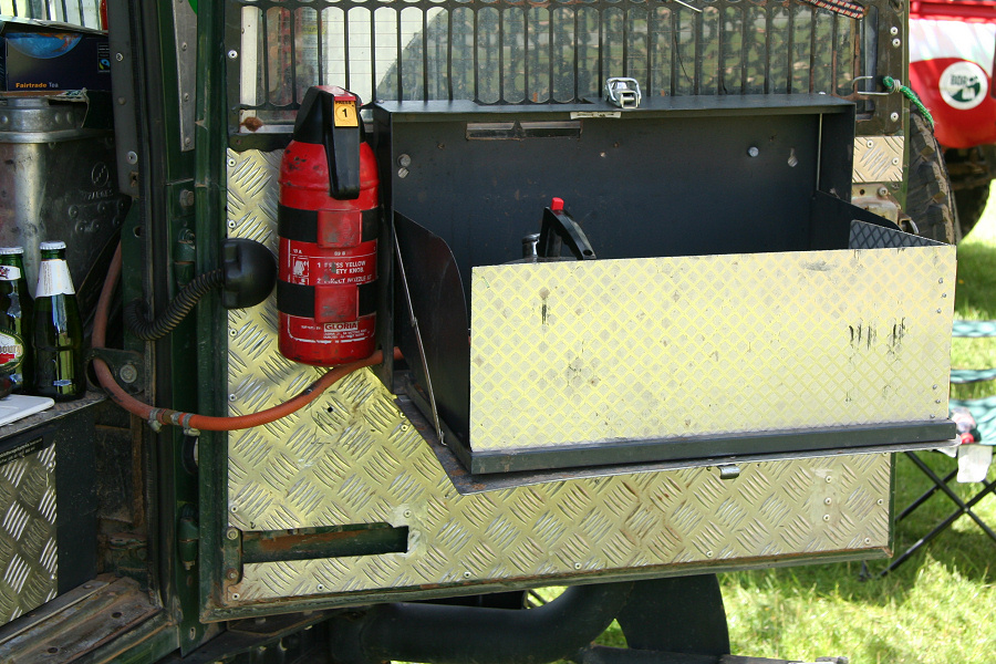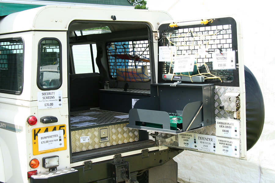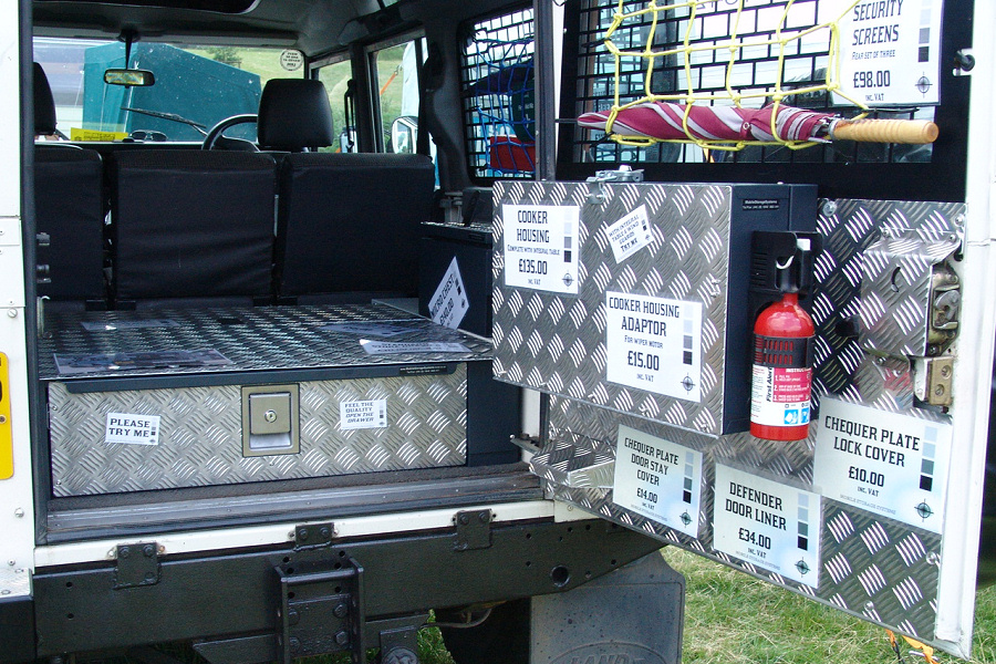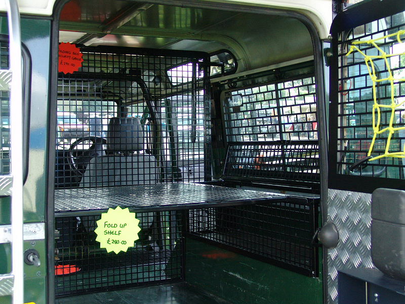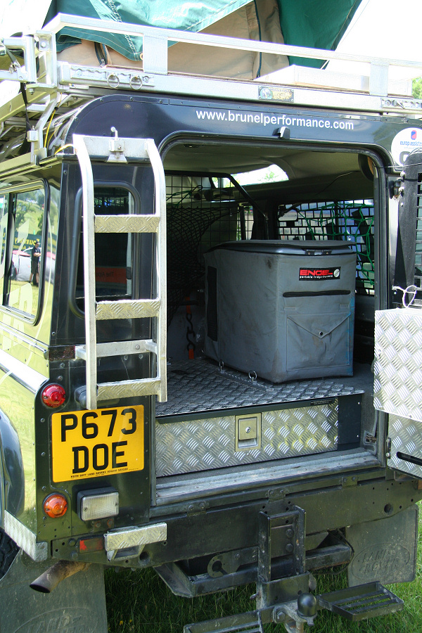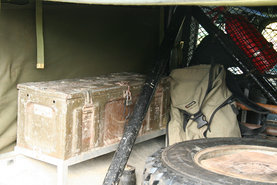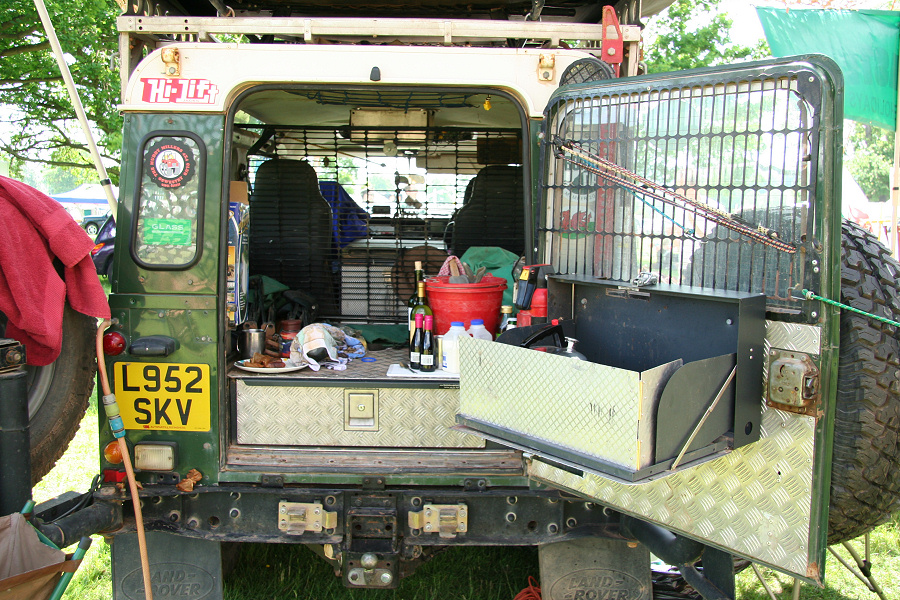 Another, more expensive option, would be plastic boxes or cases (eg. Pelti or Storm). Whatever type of box should be lashed down or prevented from moving some other way. However, I usually transport my stuff in bags, which are easier to carry and stand out less when undertaking other activities with friends. Using boxes, cases etc is also not a very flexible system. If I want to carry a large object, I would have to remove all the boxes and store them somewhere. It would be a simple option to find and buy some strong boxes of the right size and place a board on top of them as a sleeping platform. If I could find strong enough boxes with flat lids, I wouldn't need to use the board. I could make my own boxes from chequer plate to the size I want, or at least pay somebody that can weld aluminium to make them for me. Dedicated Metal CagesA box in the footwell, a removable shelf in the back with bins to either side and a table on the rear door for cooking looks a very good idea. Note the shape of the foot well cage allowing for the seat belt reel. The above stowage solutions were supplied by Overland Expedition Company, but their web site http://www.oec4x4.com/ does not seem to work fully yet (August 2006). I saw the Mantec version first, but have not photographed it. Drawers and Shelf on Rear DoorAnother popular commercial option is a metal drawer supplied by Mobile Storage Solutions. The Mobile Storage System’s drawer is not as long as the load bed. The remaining bit of the load bed is filled with a chest. There are various sizes for the different Land Rovers. They also make a matching side bin. More details, including the cooker shelf also shown below, can be found at their web site http://www.mobilestoragesystems.fsnet.co.uk/. It would be cheeper if I made my own wooden drawers. The shelf on the back door is good for cooking on. I could buy one ready made, or build my own. Plywood LiningIt is normal practise to ‘line’ the back of a van with plywood to protect the bodywork etc. This can incorporate shelves or little cubby holes for stuff, tools, materials etc. It is an option with Land Rovers, but usually the ones equipped with hard tops. Plywood can be resistant to water, strong and easy to work (cut, join etc) at home without the need to weld. It is possible to incorporate a false floor or sleeping platform with this sort of system. Plywood can also be used to build a bulkhead to separate the ‘cab’ and ‘back’ of the truck. I however have the 5 door Country Land Rover, without the bulkhead, so I can push the driver’s seat further back for a more comfortable driving position. This solution also incorporates a sleeping platform, not usually needed by labourers, but useful to Stig, who owned this Land Rover Defender 110. Side binsA set of side bins are boxes that go on top of the wheel boxes at the side of the pick up bed. Stuff can be put in them to stop it rolling around, and keeps the deep bit of the load bed clear. The boxes don’t have to be solid. They could be made from mesh on a metal frame, or just the space left next to a sleeping platform like the ‘dedicated metal cages’ elsewhere on this page. This is a popular solution for the back of vehicles (Defender 90s) used in winch challenges. RoofrackI wanted a roof rack to carry large sheets of wood or chequer plate, but I did not want to store stuff up there. I will probably produce a seperate page on my chosen roof rack solution, but for now, here are some pictures of other roof racks used for storage. A roof rack is also a good place to mount addition lights (another seperate web page int he future!). On the BonnetApart from being an alternative location for mounting the spare wheel, I could carry some stuff on the bonnet. I could use bungy cords, a cargo net or a special tray designed to carry a camouflage net. Not very secure and not very well protected from the elements. Probably just a good spot for your recovery gear that is already attached, or your camouflage net. OtherFurther ReadingI don’t copy other peoples’ (copyright) material, so if you would like to know more, take a look at;