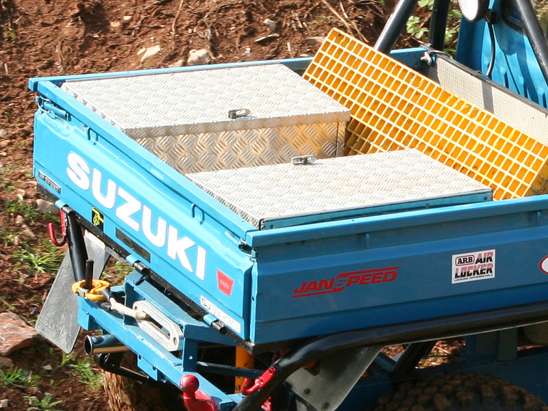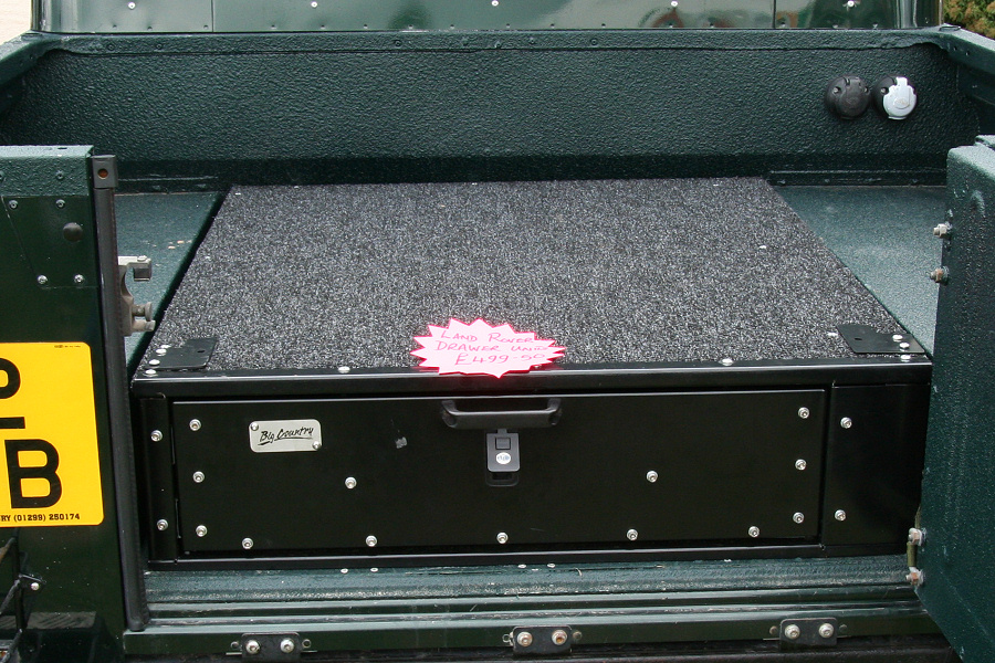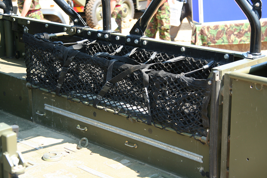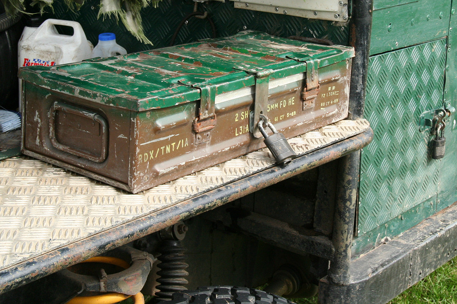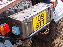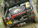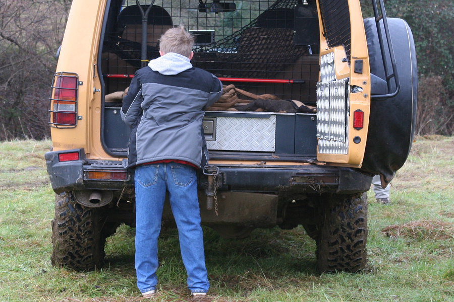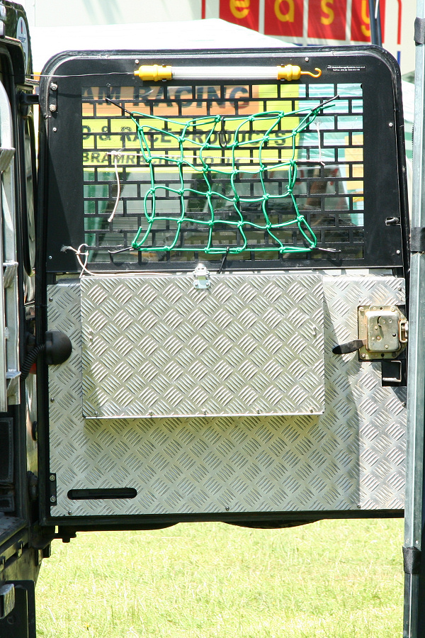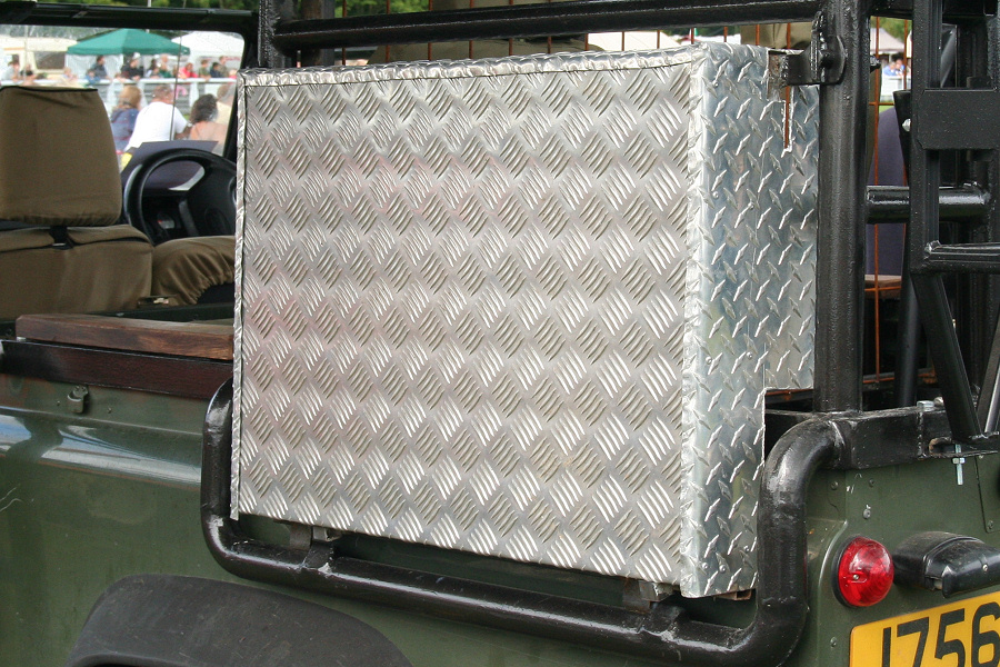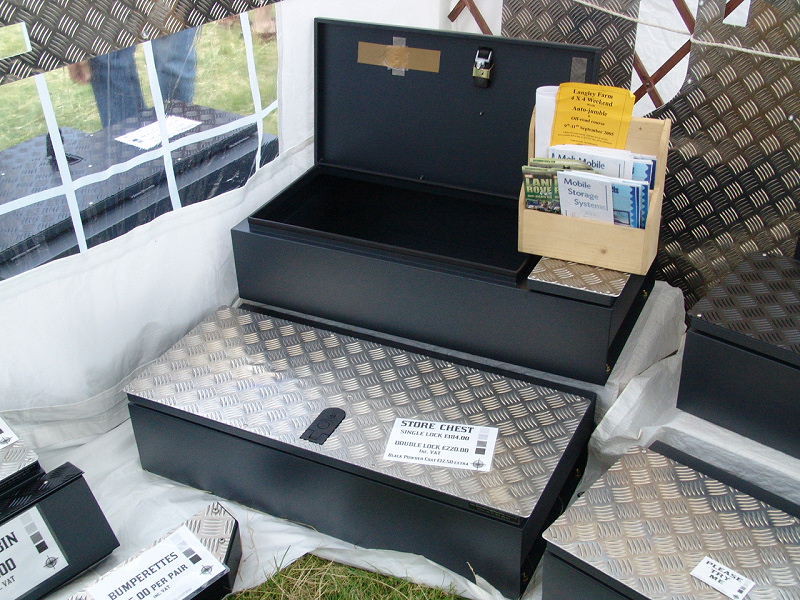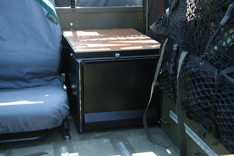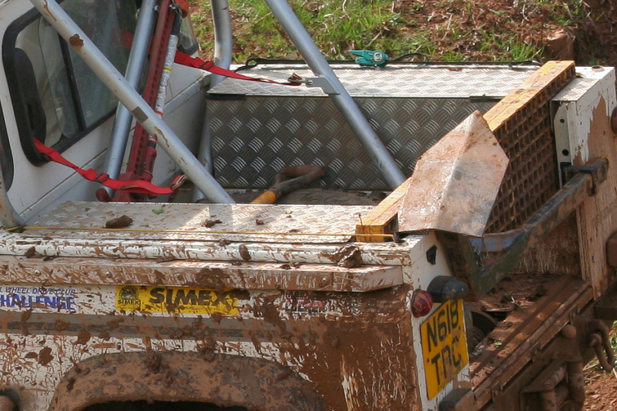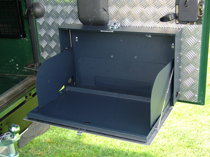 Another, more expensive option, would be plastic boxes or cases (eg. Pelti or Storm). Whatever type of box should be lashed down or prevented from moving some other way. However, I usually transport my stuff in bags, which are easier to carry and stand out less when undertaking other activities with friends. Using boxes, cases etc is also not a very flexible system. If I want to carry a large object, I would have to remove all the boxes and store them somewhere. It would be a simple option to find and buy some strong boxes of the right size and place a board on top of them as a sleeping platform. If I could find strong enough boxes with flat lids, I wouldn't need to use the board. I could make my own boxes from chequer plate to the size I want, or at least pay somebody that can weld aluminium to make them for me. Dedicated Metal CagesA box in the footwell, a removable shelf in the back with bins to either side and a table on the rear door for cooking looks a very good idea. Note the shape of the foot well cage allowing for the seat belt reel. The above stowage solutions were supplied by Overland Expedition Company, but their web site http://www.oec4x4.com/ does not seem to work fully yet (August 2006). I saw the Mantec version first, but have not photographed it. Drawers and Shelf on Rear DoorAnother popular commercial option is a metal drawer supplied by Mobile Storage Solutions. The Mobile Storage System’s drawer is not as long as the load bed. The remaining bit of the load bed is filled with a chest. There are various sizes for the different Land Rovers. They also make a matching side bin. More details, including the cooker shelf also shown below, can be found at their web site http://www.mobilestoragesystems.fsnet.co.uk/. It would be cheeper if I made my own wooden drawers. The shelf on the back door is good for cooking on. I could buy one ready made, or build my own. Plywood LiningIt is normal practise to ‘line’ the back of a van with plywood to protect the bodywork etc. This can incorporate shelves or little cubby holes for stuff, tools, materials etc. It is an option with Land Rovers, but usually the ones equipped with hard tops. Plywood can be resistant to water, strong and easy to work (cut, join etc) at home without the need to weld. It is possible to incorporate a false floor or sleeping platform with this sort of system. Plywood can also be used to build a bulkhead to separate the ‘cab’ and ‘back’ of the truck. I however have the 5 door Country Land Rover, without the bulkhead, so I can push the driver’s seat further back for a more comfortable driving position. This solution also incorporates a sleeping platform, not usually needed by labourers, but useful to Stig, who owned this Land Rover Defender 110. Side binsA set of side bins are boxes that go on top of the wheel boxes at the side of the pick up bed. Stuff can be put in them to stop it rolling around, and keeps the deep bit of the load bed clear. The boxes don’t have to be solid. They could be made from mesh on a metal frame, or just the space left next to a sleeping platform like the ‘dedicated metal cages’ elsewhere on this page. This is a popular solution for the back of vehicles (Defender 90s) used in winch challenges. RoofrackI wanted a roof rack to carry large sheets of wood or chequer plate, but I did not want to store stuff up there. I will probably produce a seperate page on my chosen roof rack solution, but for now, here are some pictures of other roof racks used for storage. A roof rack is also a good place to mount addition lights (another seperate web page int he future!). On the BonnetApart from being an alternative location for mounting the spare wheel, I could carry some stuff on the bonnet. I could use bungy cords, a cargo net or a special tray designed to carry a camouflage net. Not very secure and not very well protected from the elements. Probably just a good spot for your recovery gear that is already attached, or your camouflage net. OtherFurther ReadingI don’t copy other peoples’ (copyright) material, so if you would like to know more, take a look at;