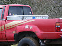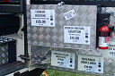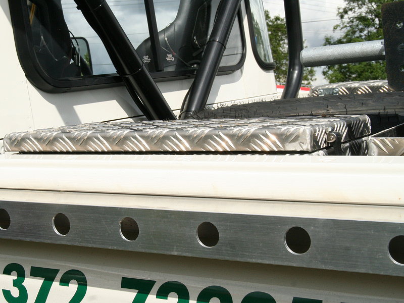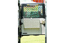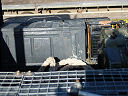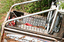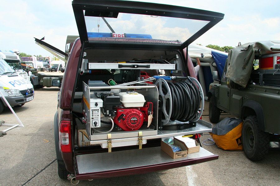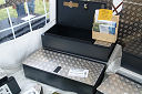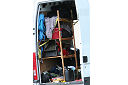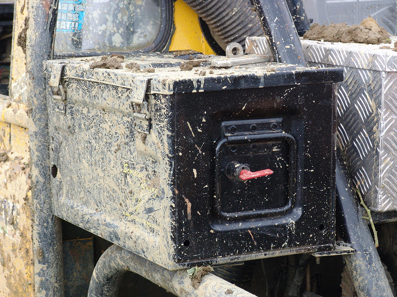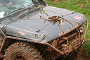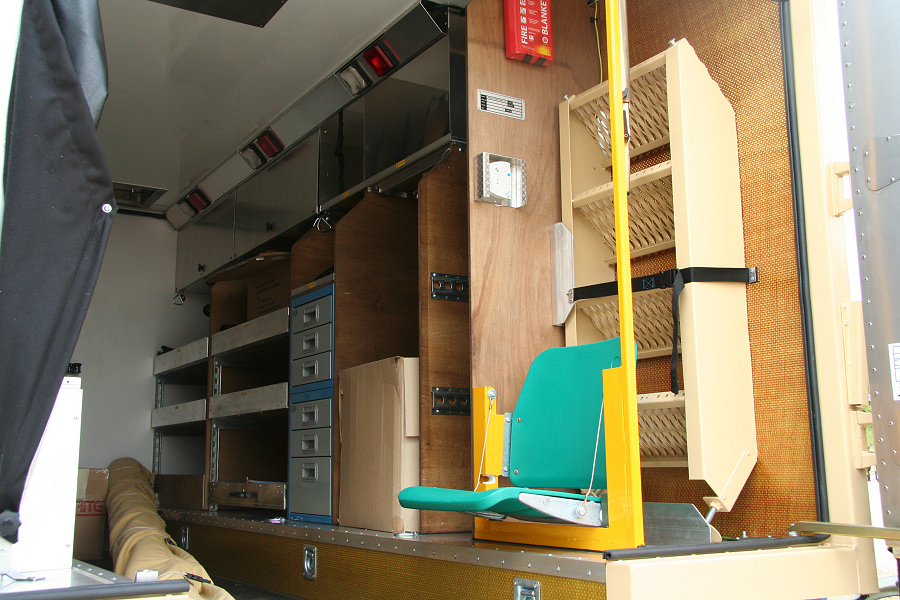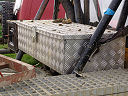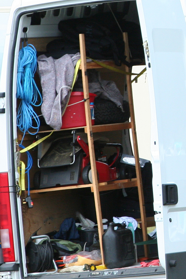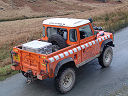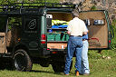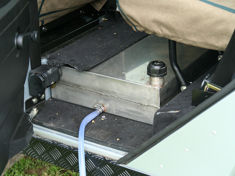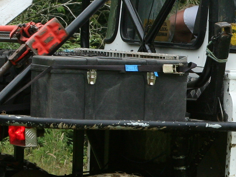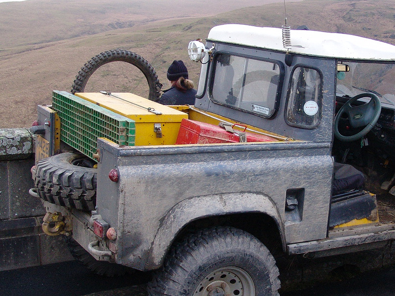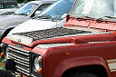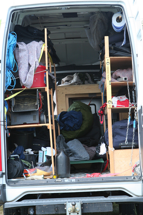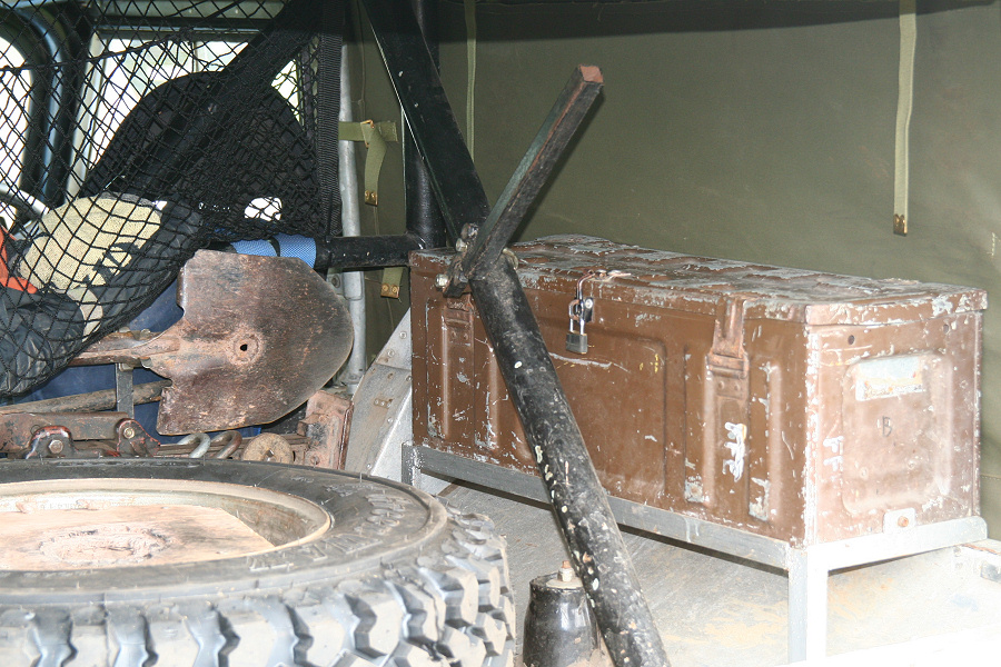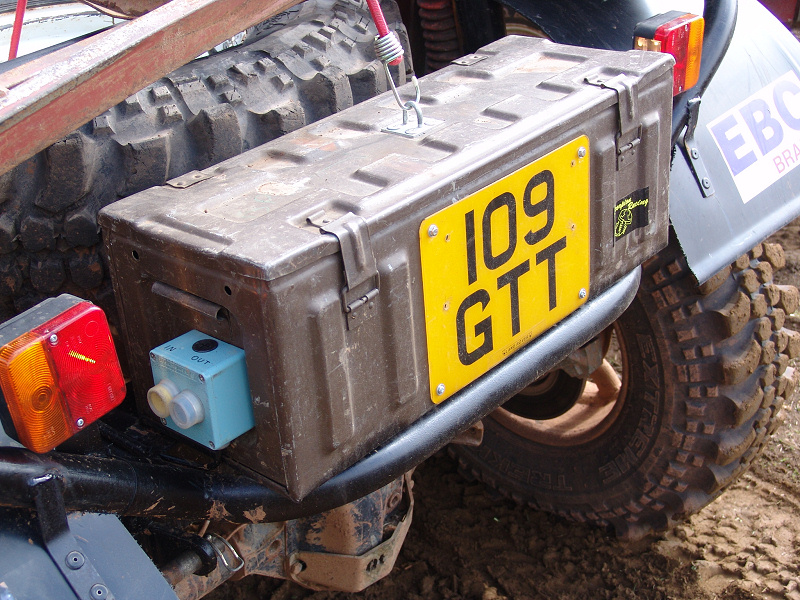 Another, more expensive option, would be plastic boxes or cases (eg. Pelti or Storm). Whatever type of box should be lashed down or prevented from moving some other way. However, I usually transport my stuff in bags, which are easier to carry and stand out less when undertaking other activities with friends. Using boxes, cases etc is also not a very flexible system. If I want to carry a large object, I would have to remove all the boxes and store them somewhere. It would be a simple option to find and buy some strong boxes of the right size and place a board on top of them as a sleeping platform. If I could find strong enough boxes with flat lids, I wouldn't need to use the board. I could make my own boxes from chequer plate to the size I want, or at least pay somebody that can weld aluminium to make them for me. Dedicated Metal CagesA box in the footwell, a removable shelf in the back with bins to either side and a table on the rear door for cooking looks a very good idea. Note the shape of the foot well cage allowing for the seat belt reel. The above stowage solutions were supplied by Overland Expedition Company, but their web site http://www.oec4x4.com/ does not seem to work fully yet (August 2006). I saw the Mantec version first, but have not photographed it. Drawers and Shelf on Rear DoorAnother popular commercial option is a metal drawer supplied by Mobile Storage Solutions. The Mobile Storage System’s drawer is not as long as the load bed. The remaining bit of the load bed is filled with a chest. There are various sizes for the different Land Rovers. They also make a matching side bin. More details, including the cooker shelf also shown below, can be found at their web site http://www.mobilestoragesystems.fsnet.co.uk/. It would be cheeper if I made my own wooden drawers. The shelf on the back door is good for cooking on. I could buy one ready made, or build my own. Plywood LiningIt is normal practise to ‘line’ the back of a van with plywood to protect the bodywork etc. This can incorporate shelves or little cubby holes for stuff, tools, materials etc. It is an option with Land Rovers, but usually the ones equipped with hard tops. Plywood can be resistant to water, strong and easy to work (cut, join etc) at home without the need to weld. It is possible to incorporate a false floor or sleeping platform with this sort of system. Plywood can also be used to build a bulkhead to separate the ‘cab’ and ‘back’ of the truck. I however have the 5 door Country Land Rover, without the bulkhead, so I can push the driver’s seat further back for a more comfortable driving position. This solution also incorporates a sleeping platform, not usually needed by labourers, but useful to Stig, who owned this Land Rover Defender 110. Side binsA set of side bins are boxes that go on top of the wheel boxes at the side of the pick up bed. Stuff can be put in them to stop it rolling around, and keeps the deep bit of the load bed clear. The boxes don’t have to be solid. They could be made from mesh on a metal frame, or just the space left next to a sleeping platform like the ‘dedicated metal cages’ elsewhere on this page. This is a popular solution for the back of vehicles (Defender 90s) used in winch challenges. RoofrackI wanted a roof rack to carry large sheets of wood or chequer plate, but I did not want to store stuff up there. I will probably produce a seperate page on my chosen roof rack solution, but for now, here are some pictures of other roof racks used for storage. A roof rack is also a good place to mount addition lights (another seperate web page int he future!). On the BonnetApart from being an alternative location for mounting the spare wheel, I could carry some stuff on the bonnet. I could use bungy cords, a cargo net or a special tray designed to carry a camouflage net. Not very secure and not very well protected from the elements. Probably just a good spot for your recovery gear that is already attached, or your camouflage net. OtherFurther ReadingI don’t copy other peoples’ (copyright) material, so if you would like to know more, take a look at;